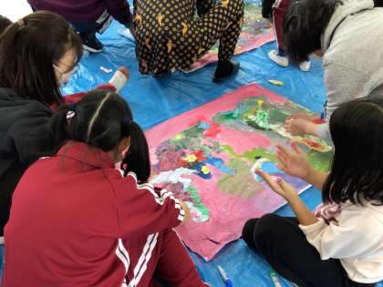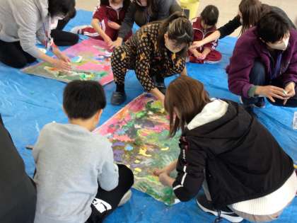 アクリル絵の具を使って、手や足で自由に着色していきました。
