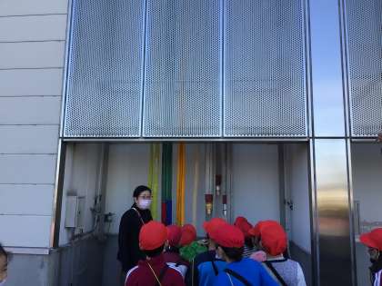 はしご車を見て、消防士さんたちが訓練をしている建物を見学しました。