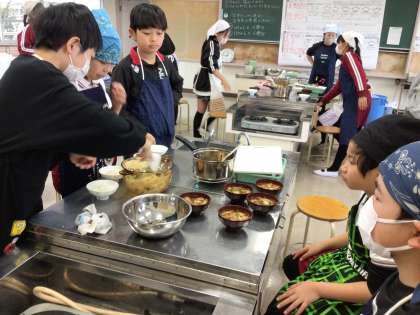 1月18日 家庭科 5年生 公開日 2024/01/18 更新日 2024/01/18 校長室から 今日は調理実習です。 ご飯を炊いて、お味噌汁を作りました。 家庭科室は、お出汁と味噌の香りでいっぱいでした。