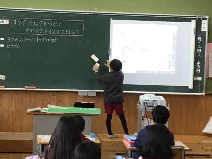 12個の数図ブロックを3つに分ける方法をみんなの前で説明しました。