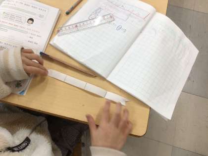 2月21日 算数 2年生 公開日 2024/02/21 更新日 2024/02/21 校長室から 紙テープを使って、分数の学習をしました。 半分は2分の1、半分の半分は? 紙テープに印をつけて、確認しました。