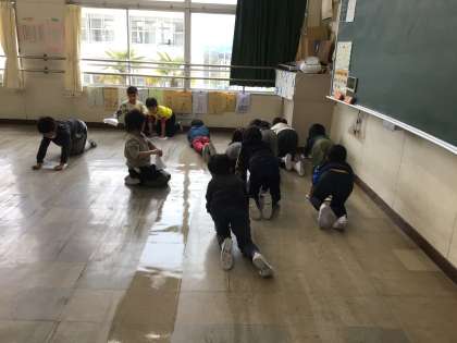 廊下に机と椅子をすべて運び出し、空っぽになった教室の床をきれいにしました。