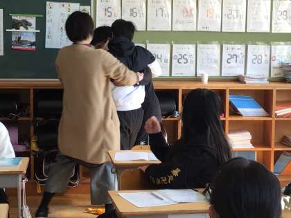 3月13日 ドッキリ 6年生 公開日 2024/03/13 更新日 2024/03/13 校長室から 卒業式まで担任の先生に毎日ドッキリをしかけています。 ある日の朝は、担任が教室に来たらびっくり! 全員机を後ろ向きにして座っていました。 今日は、授業中急にけんかが始まりました。 予定より早く先生が止めに入ってしまい、もう一度仕切り直し。 演技力バッチリでドッキリは大成功でしたが、先生の心臓はドキドキでした。