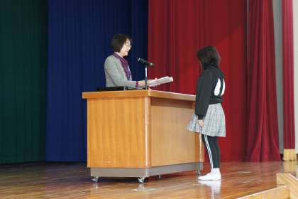 修了証を代表児童が受け取り、それぞれの学年を終えました。