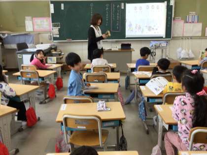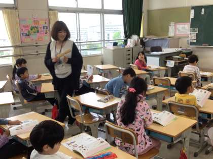 4月24日 国語 1年生 公開日 2024/04/24 更新日 2024/04/24 校長室から 先生のウッドブロックのリズムに合わせて、「あいうえおのうた」を声をそろえて言います。 はじめに1号車(1列目)の子が言います。先生が「ハイ」の後、それ以外の子が繰り返します。 先生の「ハイ」を「ヘイ」と聞き違えていた子がいて、先生の「ハイ」にかぶせて「ヘイ」が入り混じっていました(笑)。