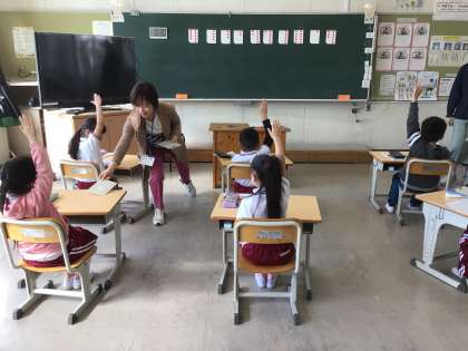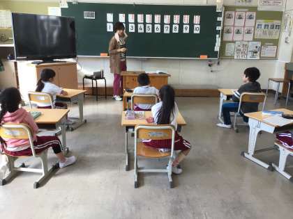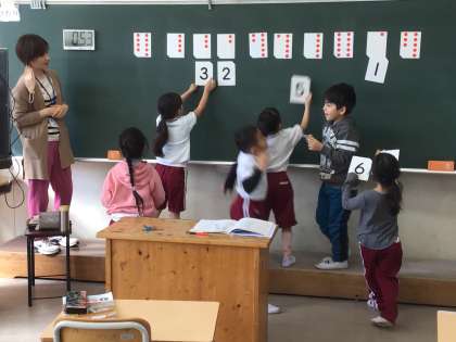 ドット数と数字を合わせます。 先生から配られた数字カードを黒板に貼ります。