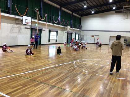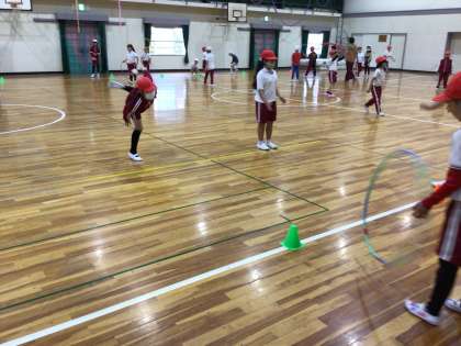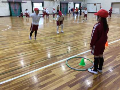 フラフープを小さなカラーコーン目がけて投げます。 難しそうです。