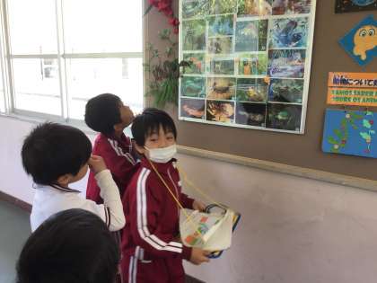 渡り廊下の掲示物、「アルマジロがいた!」 「ここは理科室だよ」