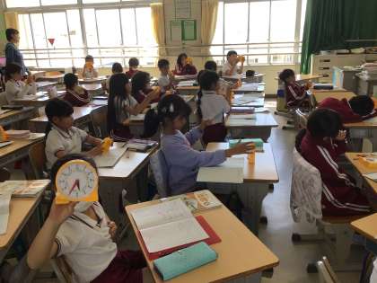 時計の長い針を動かして、「1時間前」「1時間後」の学習をしました。 先生と同じになったかな?