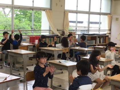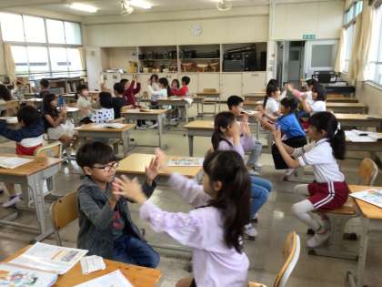 歌いながら手遊びをしました。 歌っている余裕のない子も・・・。 「頭、肩、パン、パン・・」😓