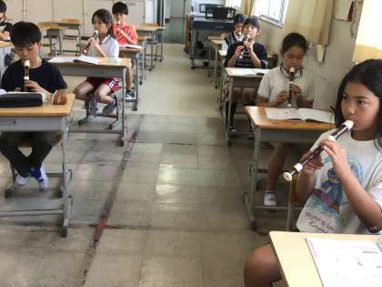 5月24日 音楽 4年生 公開日 2024/05/24 更新日 2024/05/24 校長室から リコーダーの美しい音色が・・・。 4年生が「風のメロディー」を演奏していました。 演奏後「腕を上げたね!きれいな音、すごい」 とほめたら、???腕を上げてくれている子が数人いました。