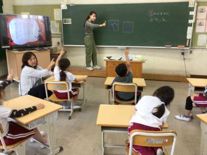 今日は「や」と「ゆ」を習いました。 先生といっしょに「や」を書きます。