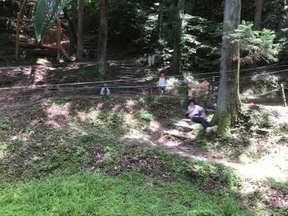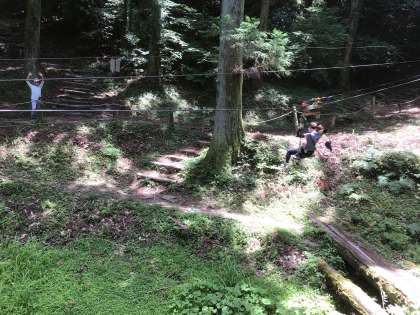 先生たちもアスレチックで大絶叫! 沢に帽子を落とした先生も。