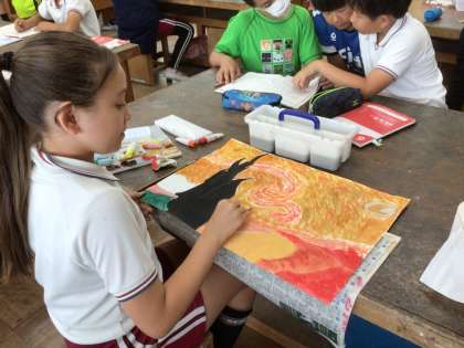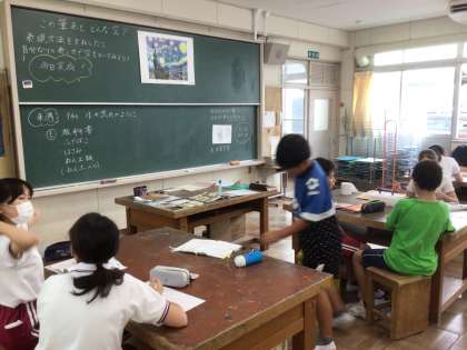 7月2日 図工 6年生 公開日 2024/07/02 更新日 2024/07/02 校長室から ゴッホの星月夜が黒板に掲示してありました。 「この筆あとどんな空?」 ゴッホになった気分で、空を描いてみました。