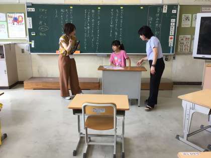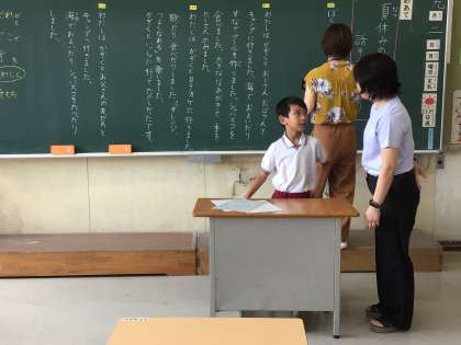 9月2日 夏休みの思い出 国際2年生 公開日 2024/09/02 更新日 2024/09/02 校長室から 夏休みの思い出を母語で話します。 日本語指導員の先生が日本語に直してくれるので、もう一度日本語で発表します。 後ろで先生が日本語で書いてくれます。 次はそれを見て、書く練習です。