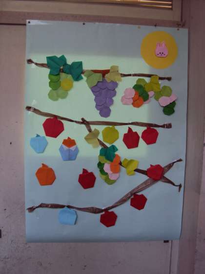 折り紙講師とひまわりタイムに秋の味覚のぶどうとりんごを作りました。