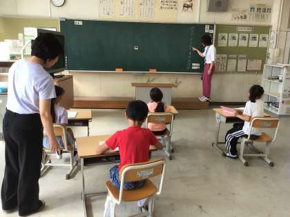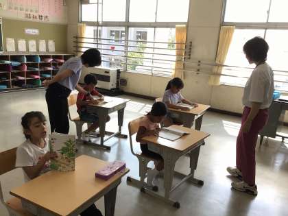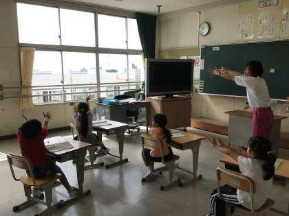 9月9日 国語 国際2年生 公開日 2024/09/09 更新日 2024/09/09 校長室から 「空にぐうんと手をのばせ」 ぐうんと手を伸ばすってどういうこと? みんなでやってみました。 その後、音読しました。