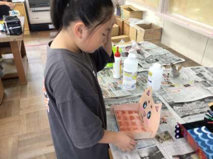 糸のこで板を切り、色を塗ってトレイを作ります。 完成に近づいてきた子がたくさんいます。