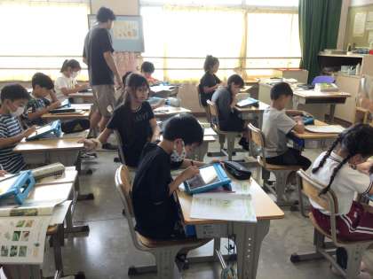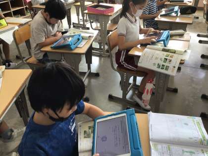 学習用タブレットのQubenaを使って、夏の終わりの植物や生き物の様子の復習をしました。