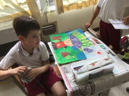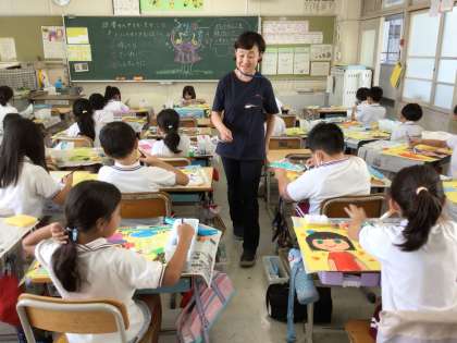 9月18日 図工 2年生 公開日 2024/09/18 更新日 2024/09/18 校長室から お話の絵(読書感想画)をかきます。 「ミリーのすてきなぼうし」を読んでもらいました。 色塗りもでき、ほぼ完成した子もいます。