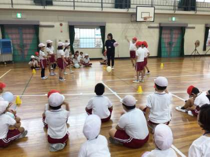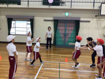 風船バレーボールをしました。 落とさないようにつないで、相手のコートに返します。
