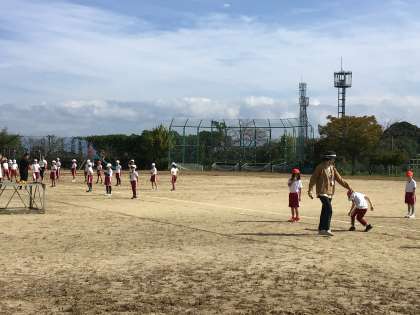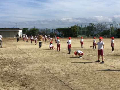 運動場で、50メートル走のタイムを測った後、ダンスの隊形に並びました。
