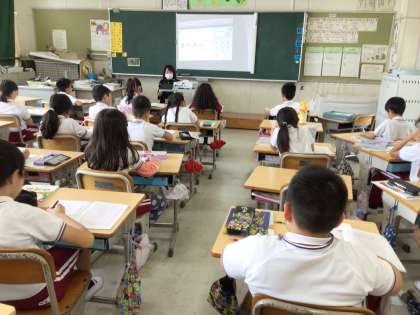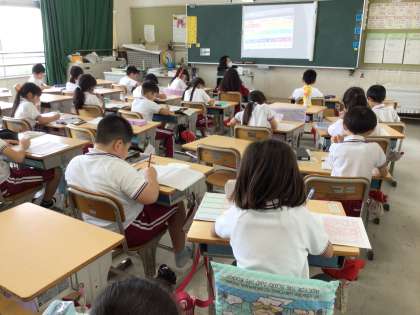 先生が、スクリーンに映し出した九九の答えをノートに書きました。