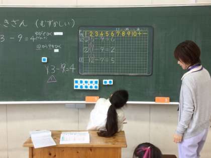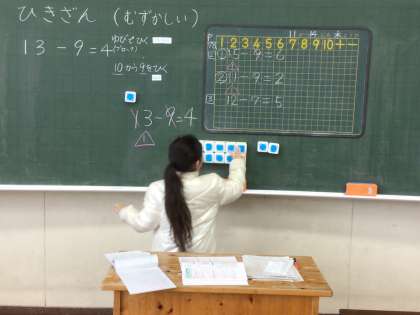 11月14日 算数 国際1年生 公開日 2024/11/14 更新日 2024/11/14 校長室から 黒板には ひきざん(むずかしい) と書かれていました。 数図ブロックを使って、確かめながら計算のしかたを学びました。