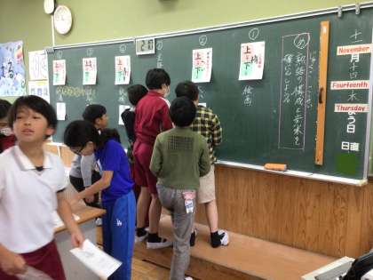 11月14日 国語 5年生 公開日 2024/11/14 更新日 2024/11/14 校長室から 熟語の構成と意味を確認しよう 二字熟語で、上の字と下の字が同じような意味をもつもの 上の字と下の字が対になるもの 上の字が下の字を説明しているもの など 自分の割り当てられた熟語を分類しました。