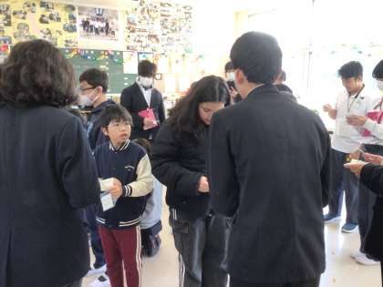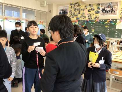 中学生のお兄さん、お姉さんと名刺交換をしながら自己紹介をしました。
