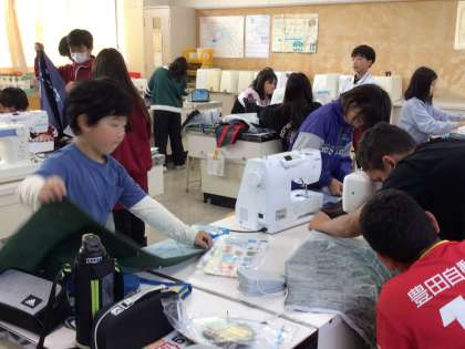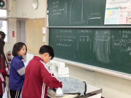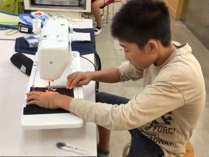 エプロンづくり ミシンを使ってエプロンを作っています。 慎重に縫っています。邪魔しないでね。