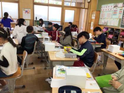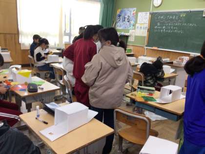 のぞいてみると 箱の中にそれぞれ自分が考えた世界を作ります。