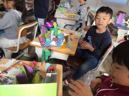 おって たてたら 紙を折り立たせます。 作りたい世界を考えて、色や形を選んでいます。