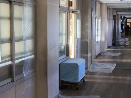 校務主任と校内整備員さんが2階の廊下の壁のペンキ塗りをしてくださっています。