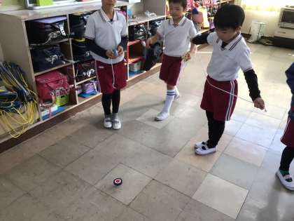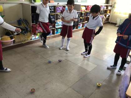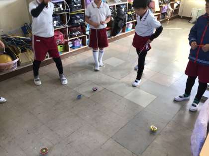 1年生の教室では、こま回しをしている子がいました。 とても上手です。