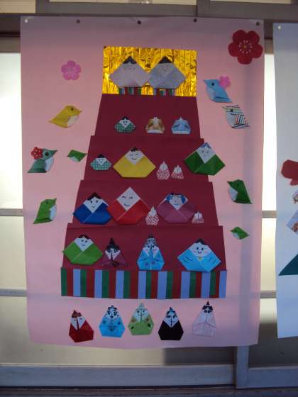 お雛さんは廊下の5段飾りに追加して貼ってあります。個性たっぷりのいろいろな顔のお雛さんができました。