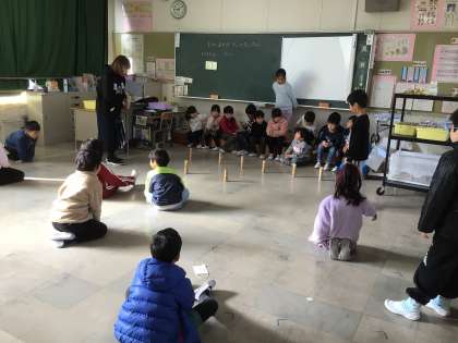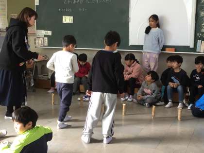 むかしあそびチャンピオン大会 だるま落としに挑戦します。 誰がチャンピオンになるのかな?