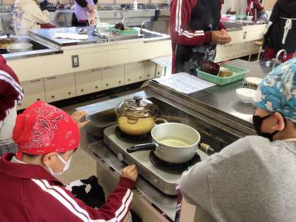 2月26日 家庭科 5年生 その2 公開日 2025/02/26 更新日 2025/02/26 校長室から 今日、5年生は調理実習の日。 1・2時間目は2組、3・4時間目は3組、5・6時間目は1組がご飯を炊いて味噌汁を作ります。 3時間目、においにつられて、家庭科室へ行くと 「ご飯が焦げた!」 という声が。 「味噌汁、がんばろう!」 とすぐに切り替えることができるのも、この子たちの長所です。