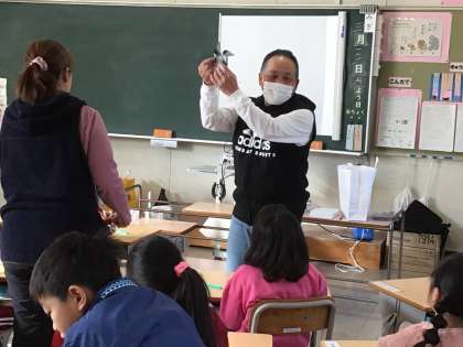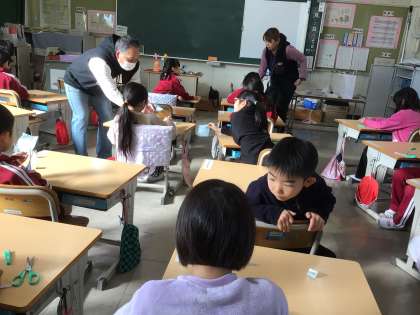 講師に折紙ボランティアさんに教えてもらい、風車を作りました。 2時間目は外へ出て回してみます。