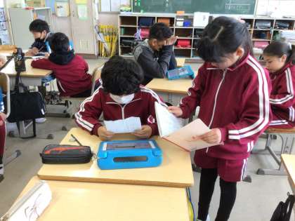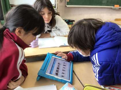 発表の練習 学習用タブレットを見ながら読み合わせをしました。