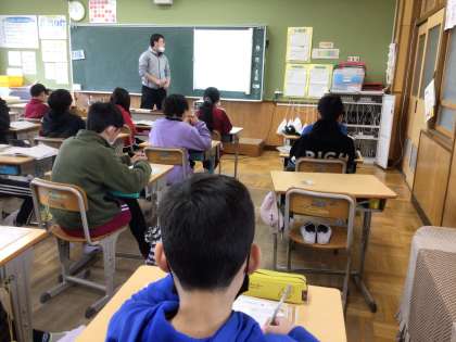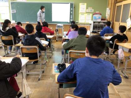 隣のクラスの先生が外国語の授業をしてくれました。 いつもと違っていいね。