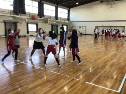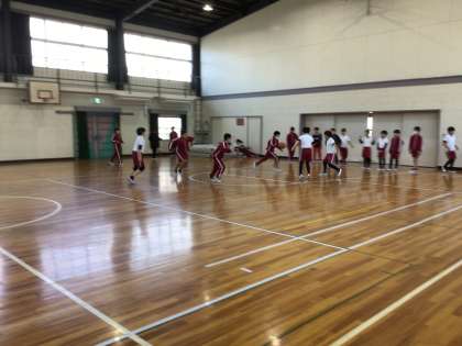 体育館で、元気よくバスケットボールのゲーム練習をしました。