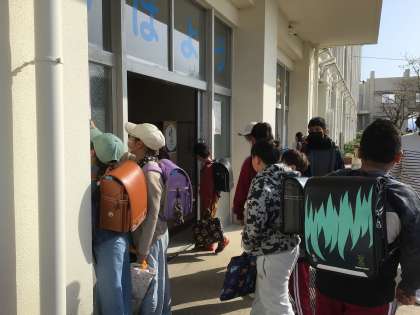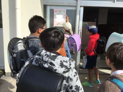 昇降口玄関で、自分のクラスを確認します。 歓声が上がっていました。