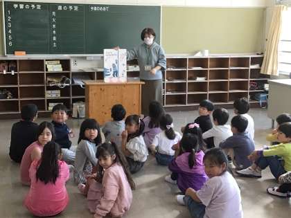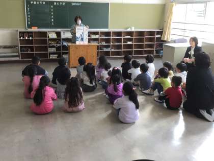 今日は1年生初めての読み語りです。 子どもたちの後ろで、お家の方も一緒に参加してくださいました。