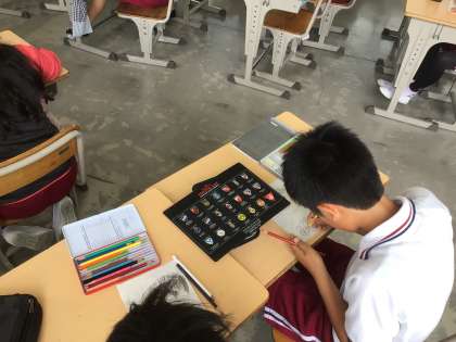 級訓の掲示物作り 自分の顔を描いていました。 大きな紙に貼るのですね、きっと。