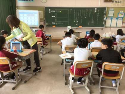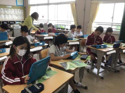 植物図鑑を作ろう 学習用タブレットを使って、生き物図鑑を作成しています。