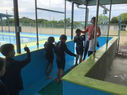 6月12日 プール 1年生 公開日 2025/06/12 更新日 2025/06/12 校長室から 久しぶりに太陽が顔を見せてくれました。 1時間目から1年生はプールに入りました。 シャワーを浴びて、プールサイドに並びました。