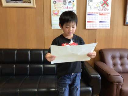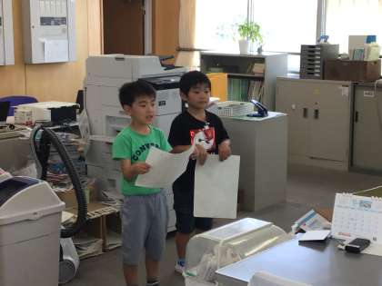 6月30日 聞いてください 1年生 公開日 2025/06/30 更新日 2025/06/30 校長室から 職員室にいると 「しつれいします。こうちょうせんせいにようじがあってきました」 と、かわいいお客さんが2人。 「なあに?」と聞くと 「聞いてください」というので、校長室へ。 国語で書いた文章を聞かせてくれました。 はきはきと上手に読むので、「職員室の先生にも聞いてもらおう」 と2度目の「聞いてください」をがんばりました。