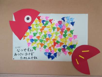 本日、図書整備ボランティアさんに、折り紙教室で子どもたちが折ったいろんな顔をした小魚を使って装飾をしていただきました。夏休みに向けたメッセージも書いていただき、ありがとうございます。