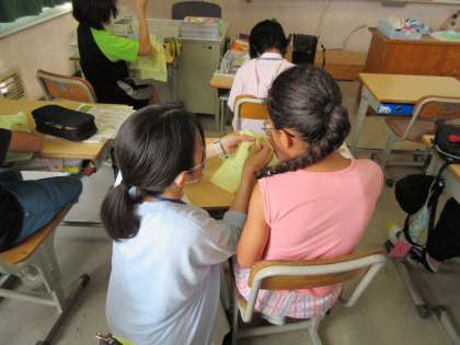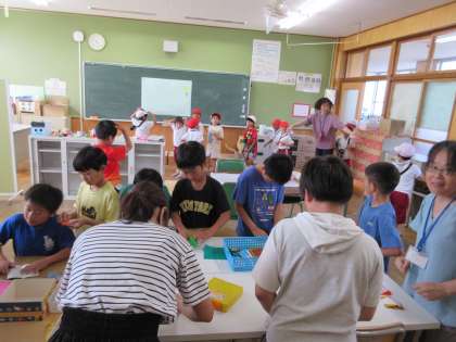 暑い中、支援学級や家庭科手縫いのサポートと折り紙教室のお手伝いに来ていただき、ありがとうございます。授業のサポートでは、子どもたちの『出来た』自信につながり、折り紙教室では、暑くて外遊びができない子たちのお楽しみの場になっています。(今日は風鈴とかき氷を作りました)いつもありがとうございます。
